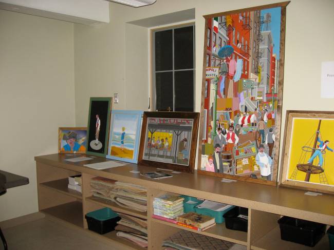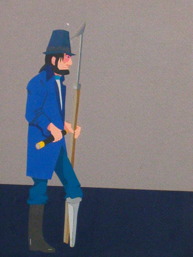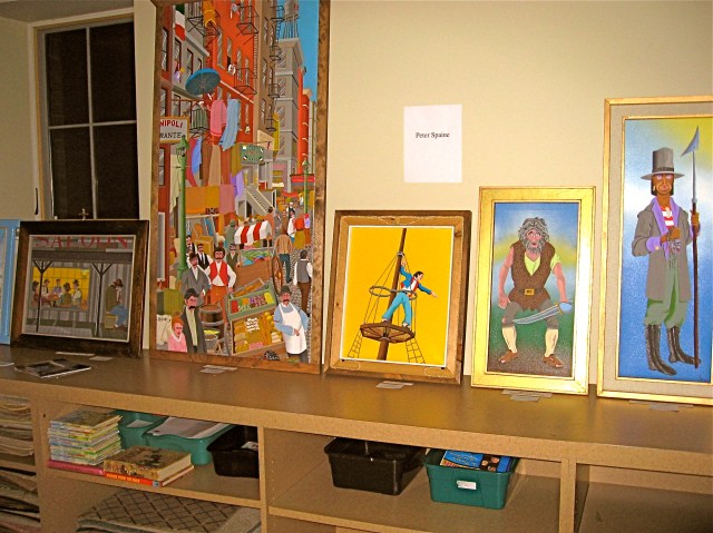 Peter paints the stories that his mind develops and prods him into fleshing out in paint. He works in acrylic and occasionally in oil. He also showed me a number of pieces he created using cut pieces of colored paper to tell the story. He very generously gave me a gift of one of these paper “paintings.” I like it very much. It portrays one of my favorite characters from American literature – Captain Ahab – who with his harpoon at the ready is staring out to sea – waiting…