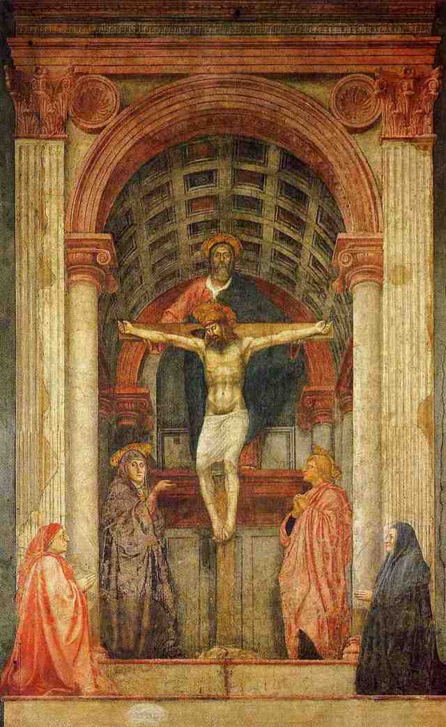 Copyright © 2012 Deacon Paul O. Iacono All Rights Reserved.  Notes on the painting: The above fresco painting and its close-up were completed by the Italian painter Masaccio during the years 1425-27. It is currently located in the church of Santa Maria Novella in Florence, Italy. This is a very important painting in the history of western liturgical art for it combines the images of the Father, Son, and the Holy Spirit (the white dove that appears as a scarf or collar around the Father’s neck). Current research mentions that the brilliant engineer and architect, Philip Brunelleschi, may have been consulted by Masaccio since he had continued the research into the ideas of linear perspective. You can view this sense of linear perspective in this painting in the three dimensional aspect of the vaulting behind the figures. Brunelleschi had continued the studies on linear perspective that were started by the famous painter from Siena, Peter Lorenzetti, in the early 1300’s.
