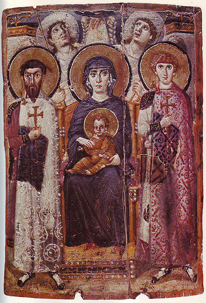 The color red of Mary’s inner cloak (as well as Jesus’ outer cloak) represents their human nature. The orange trim of her cloak represents the specific spiritual illumination, and self knowledge, of her status as the Mother of Jesus’ human nature, not His divine nature.